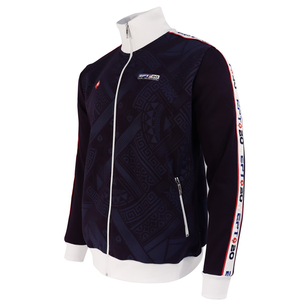 Refresh your outerwear collection with the EPT20 track top. Decorated with a court card pattern and luxury satin piping detailing down each arm, the top also includes the iconic spade and EPT20 logos to the chest for instant PokerStars recognition. A premium polyester/cotton fabric, central zip closure and ribbed hems guarantee supreme comfort, whilst two zipped hand pockets provide ample space for small essentials.