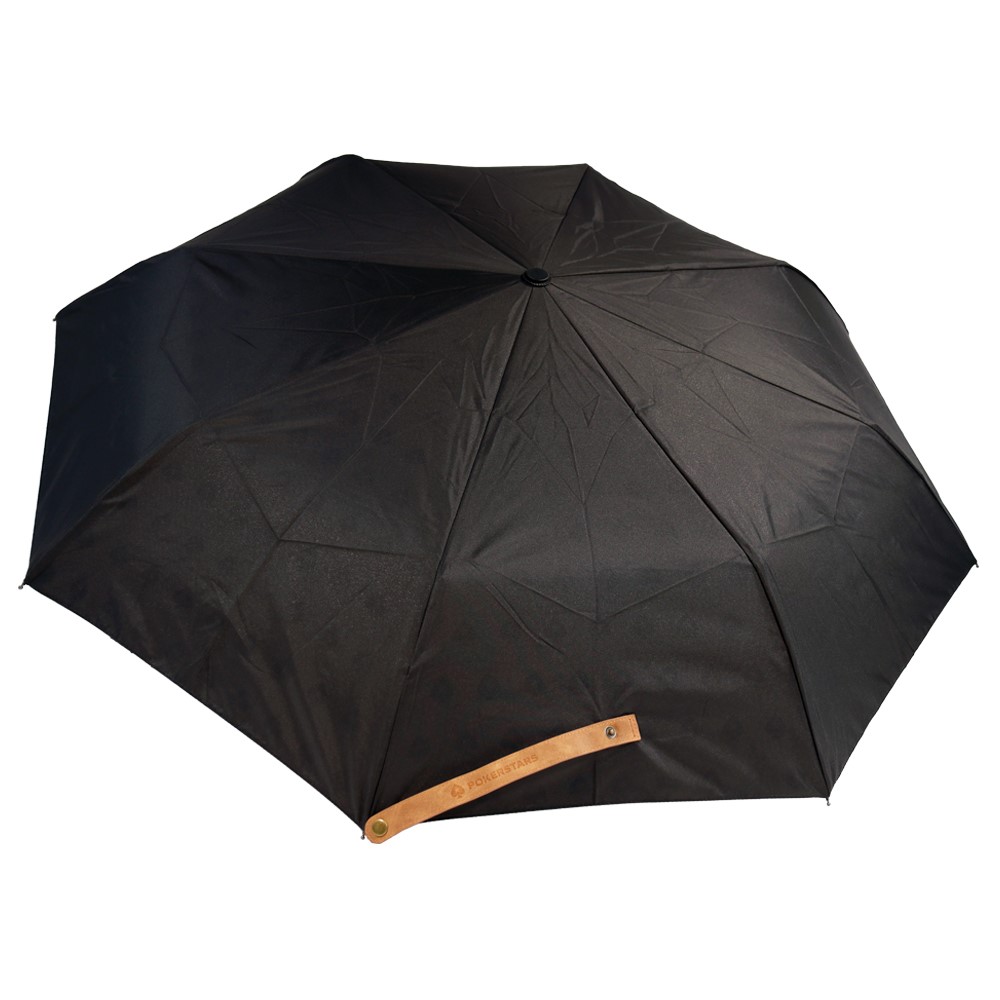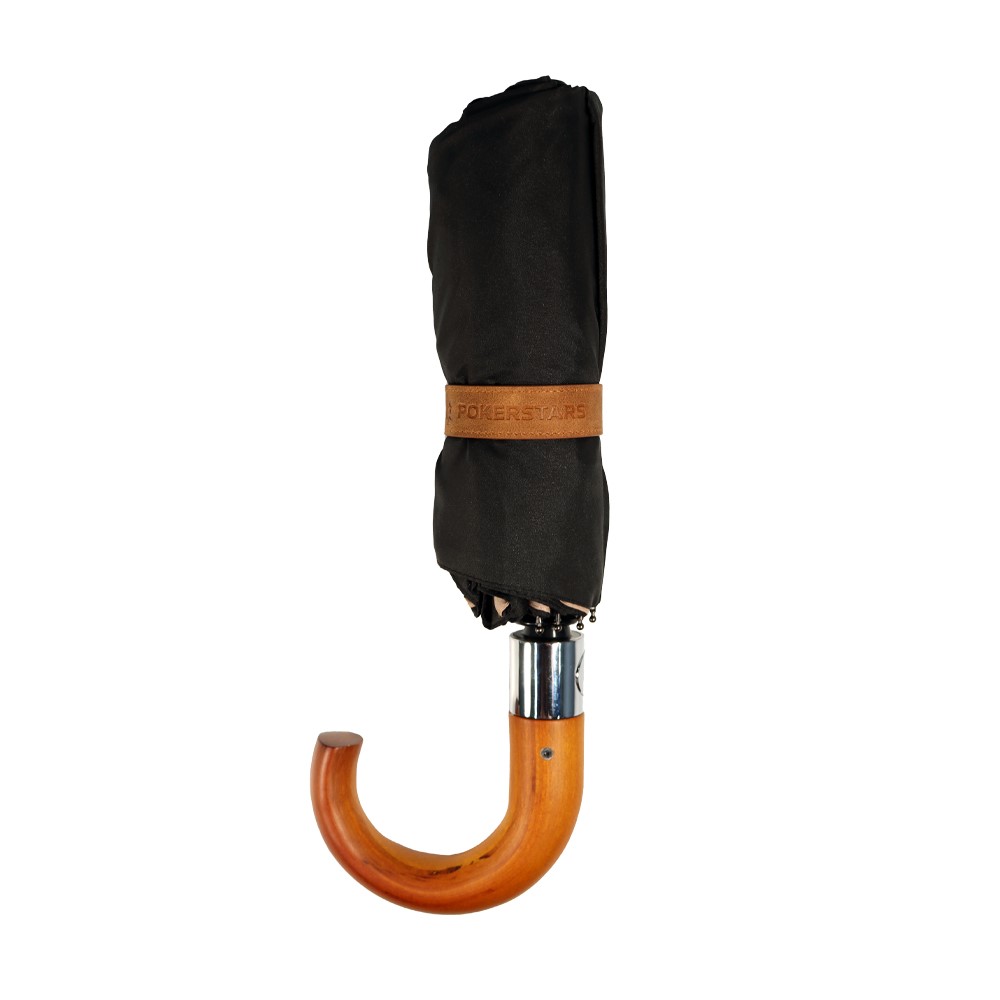 Our classic 21-inch folding umbrella is perfect for keeping you dry during those unexpected rain spells. The double-layer polyester fabric provides ample protection, whilst the beige lining includes a stylish pattern of unmistakeable PokerStars spades for a classy touch.The handle is made from composite wood, and the storing pouch in matching fabric adds an extra layer of protection when not in use.Debossed logo on PU strap with button.The umbrella also features an auto-opener for convenience, and a manual closing option.