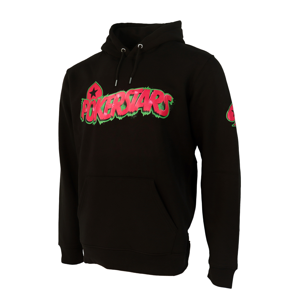 Bring a truly different look to your PokerStars wardrobe with this premium black graffiti hoodie. Featuring unique pink and green branding to the chest and the iconic PokerStars spade on the upper left arm. The hoodie also has a double layered hood and spacious kangaroo pocket at the front for extra comfort.