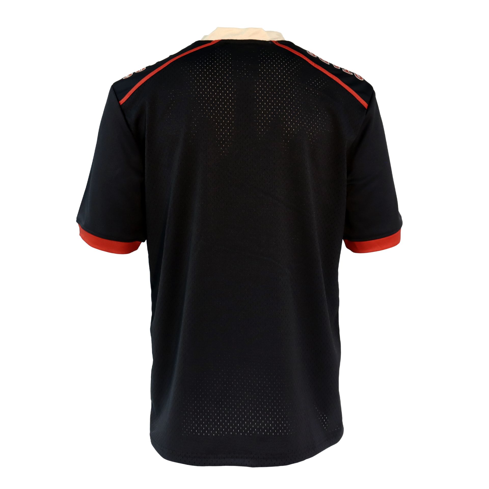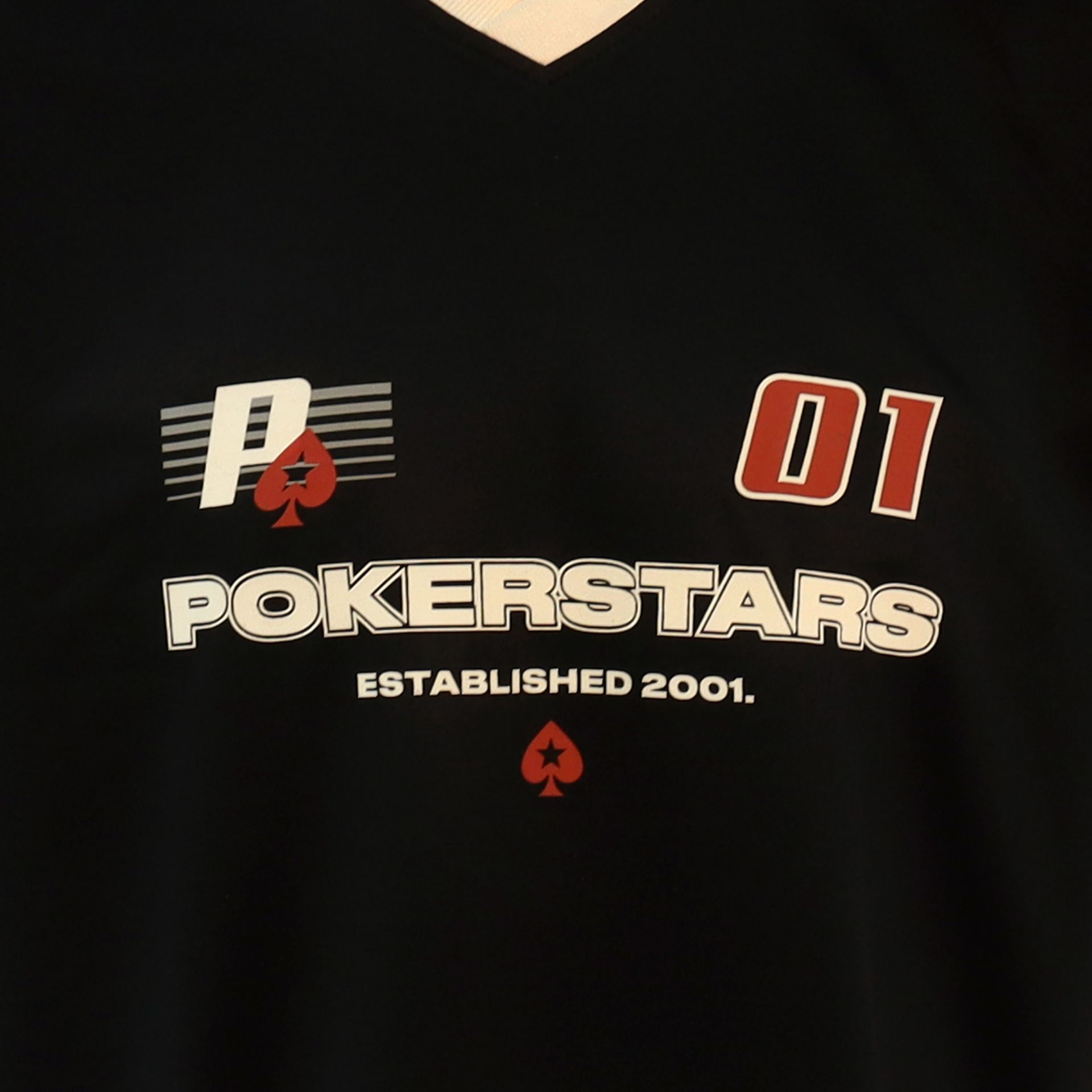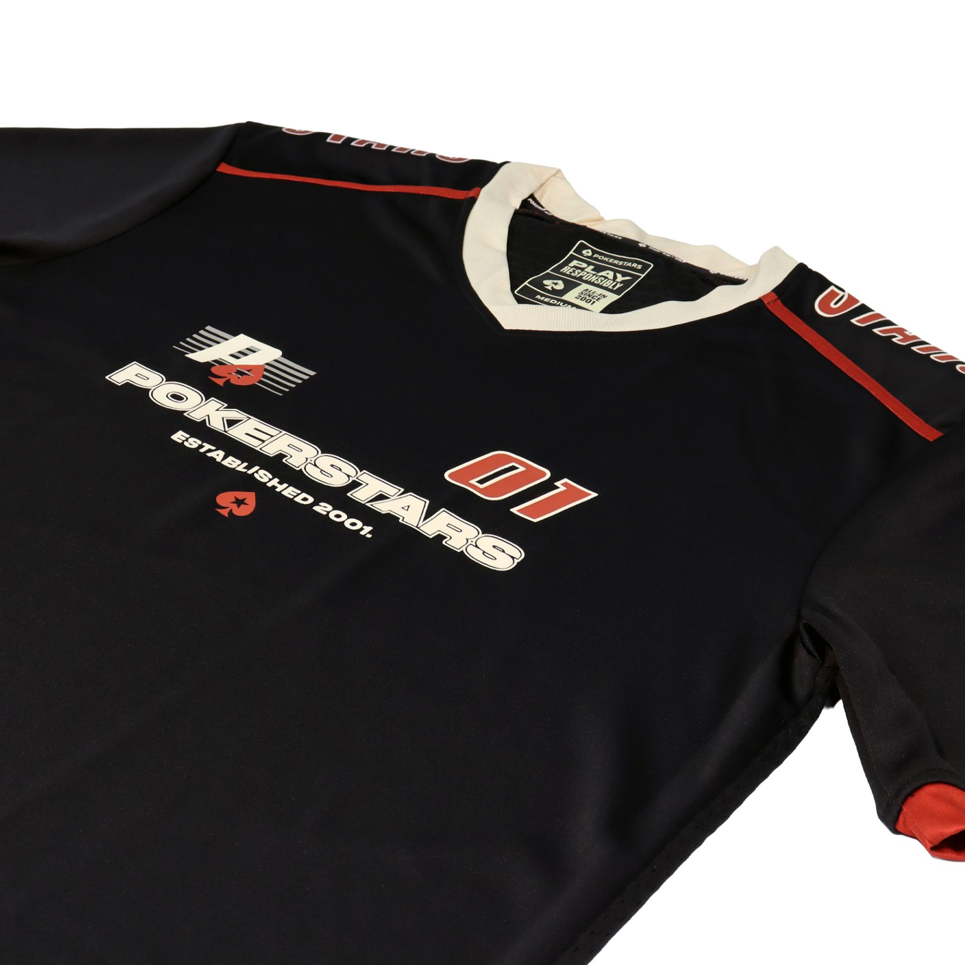 Get into the action with this black PokerStars jersey shirt in a football style. Oversized for your comfort, it’s crafted from 100% polyester to ensure a loose-fitting, relaxed feel. The red trim on the cuffs and shoulders contrast perfectly against the black design, while this shirt also features a PokerStars logo on the front with “STARS” printed on the shoulders to make sure you won’t go missing in a crowd.