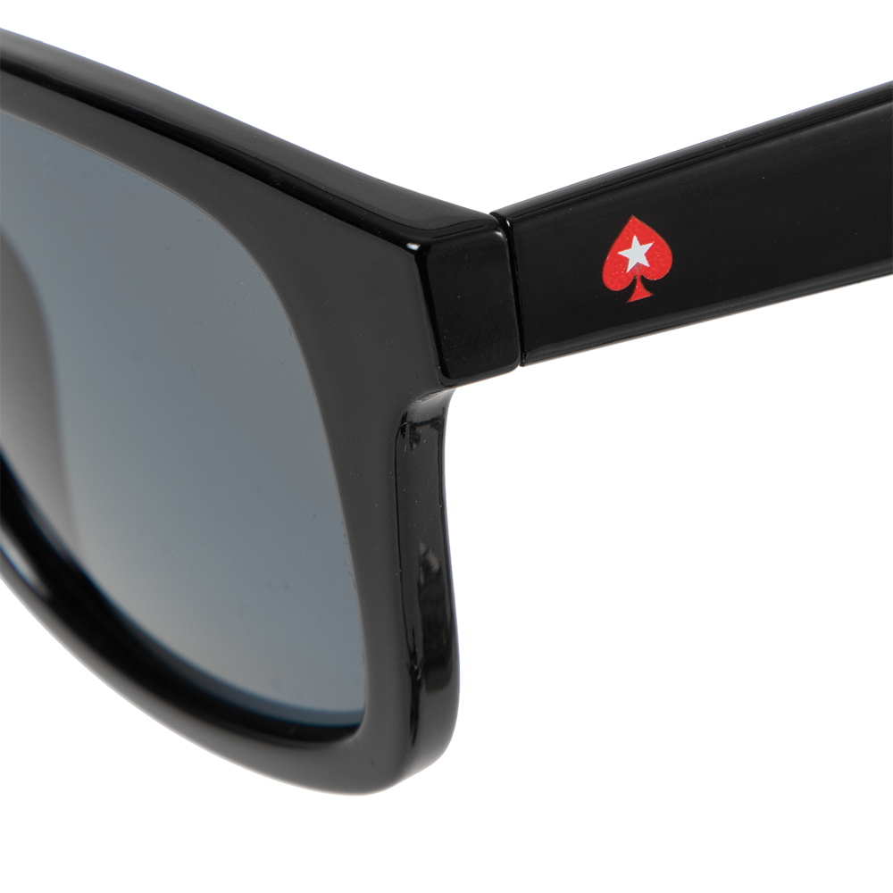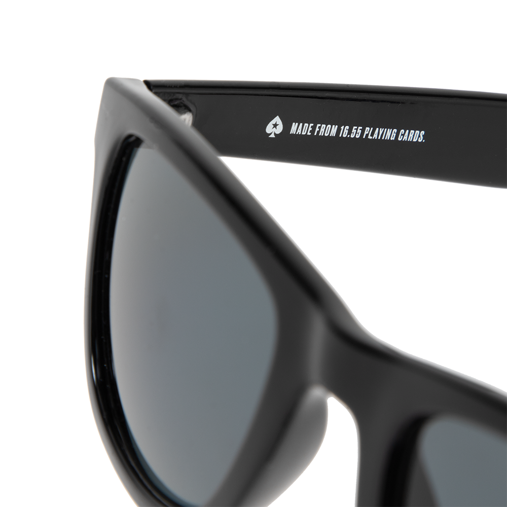 Decks become specs. Recycled playing cards were used in the production of these gloss black plastic sunglasses. They feature UV400 polarised lenses and come alongside a microfiber cleaning cloth, plastic pouch and PU leather case. All accompaniments are made from recycled materials.