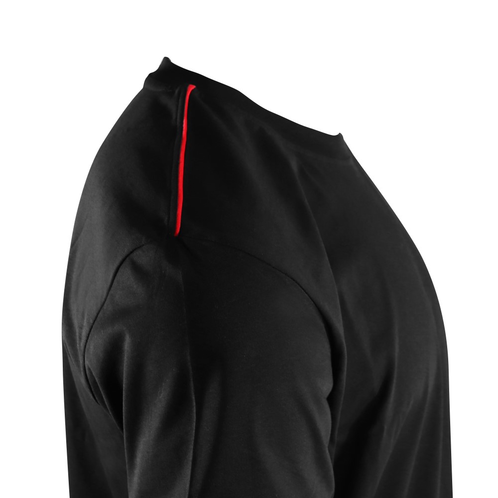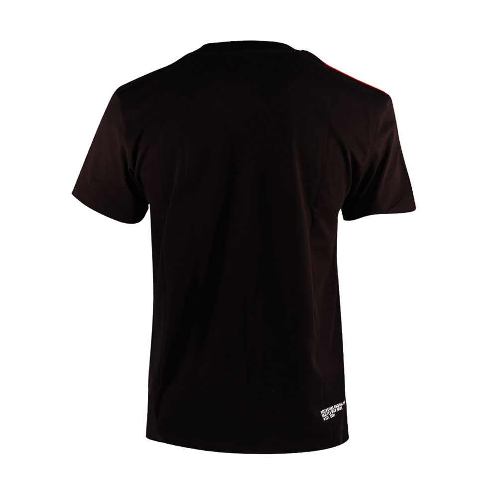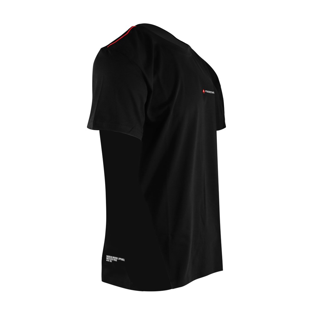 This simple, stylish black tee features classic PokerStars branding across the left chest and binding red thread across the right shoulder. Made of 100% combed cotton for added comfort, the tee also includes colour screen prints to the inner neck and bottom right of the back.