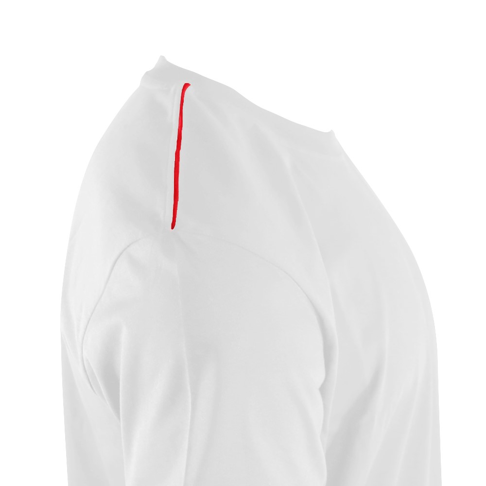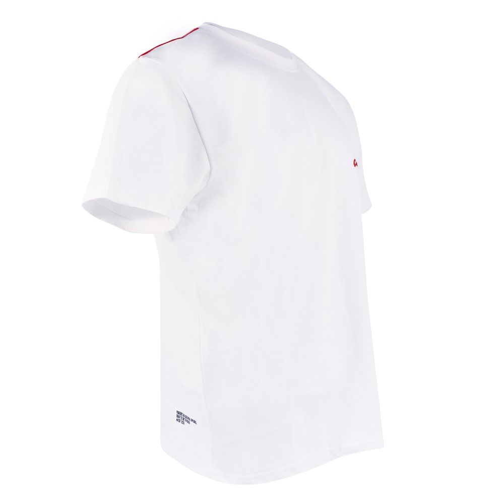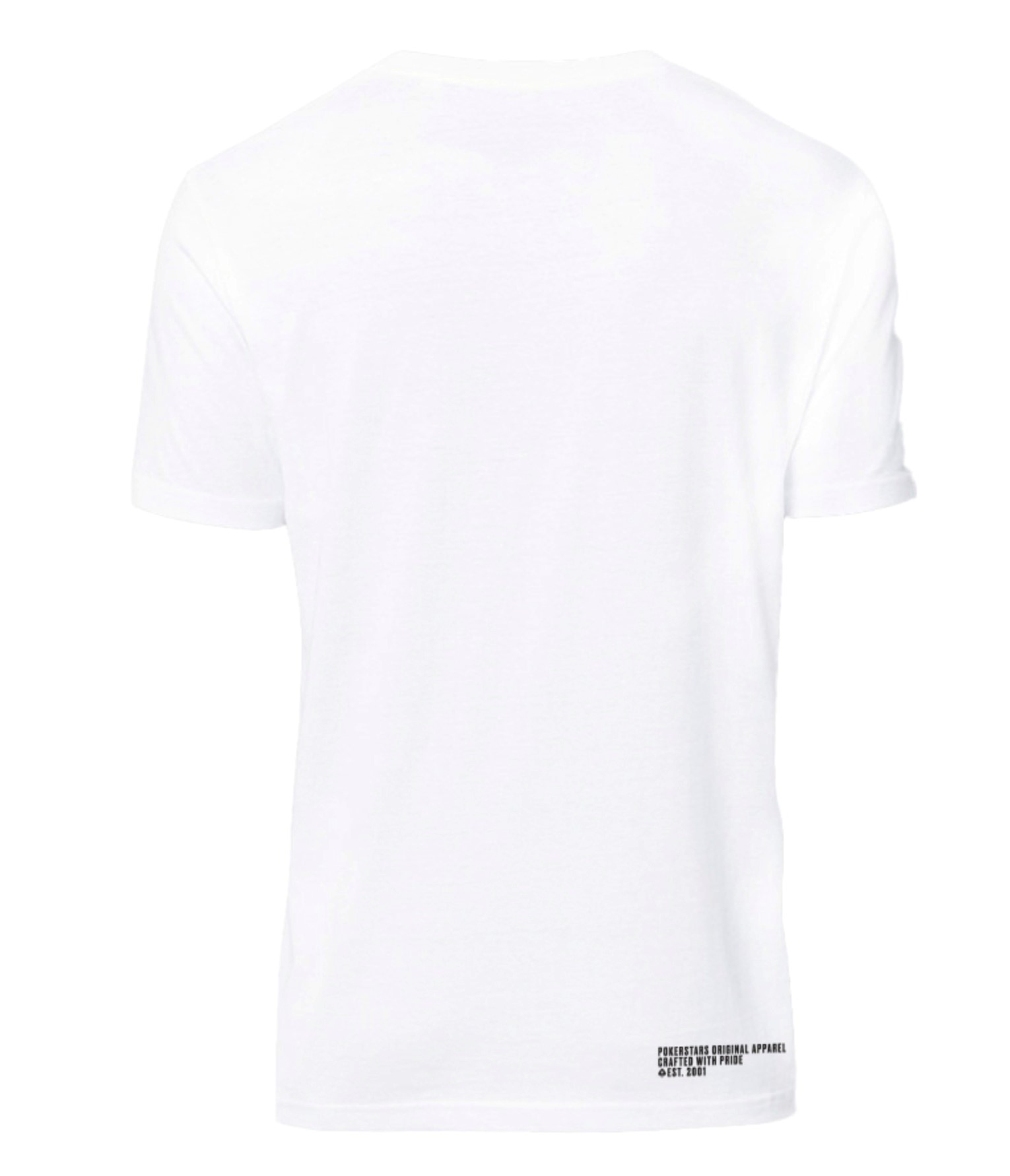 This simple and stylish white tee features classic PokerStars branding across the left chest and binding red thread across the right shoulder. Made of 100% combed cotton for added comfort, the tee also includes color screen prints to the inner neck and bottom right of the back. Also available in black.
