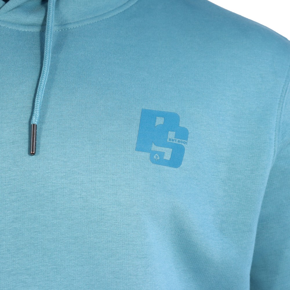 Add a dash of colour to your wardrobe with this cosy overhead turquoise hoodie. Made with brushed-back fleece for warmth and comfort, the hoodie is finished in a drop-shoulder style and classic fit for a more relaxed look. Recycled metal eyelets and drawcord tips add functional, eco-friendly details, and the spacious front pouch pocket adds extra storage space. The hoodie’s ribbed cuffs and hem provide a snug finish, making it ideal for cooler days.